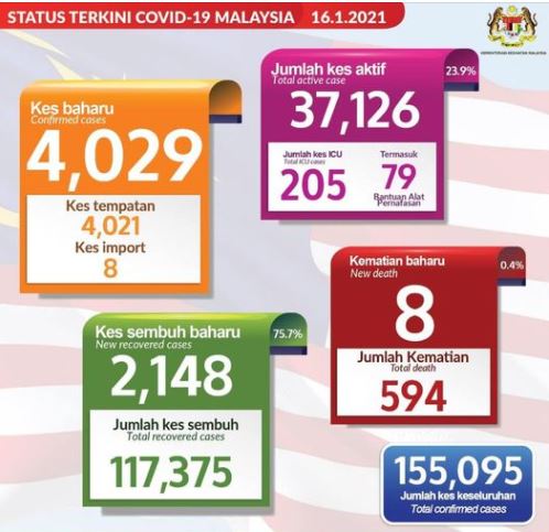 Pada hari ini pula, menerusi perkongsian maklumat di laman Facebook Kementerian Kesihatan Malaysia (KKM) jumlah kes baharu pada hari ini adalah sebanyak 4,029.